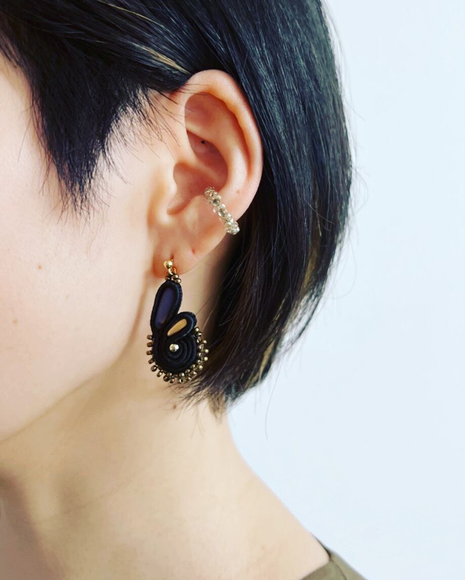 すりガラスのような質感の深いブルーと、マットゴールドのチェコビーズを合わせたソウタシエ。